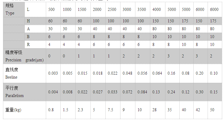 不易變形:一般鋼材材質的曲服點是30kg/mm2,一般鑄鐵件的曲服點是38kg/mm2此材質的曲服點達到110kg/mm2,抗彎曲指標遠遠超出了其它材質。 容易保管:懸掛、平放均可,不會因長期平放影響其直線度、平行度。 不易生秀:使用期間不用涂油,長期不使用,存放時輕輕地涂上薄薄的一層一般工業(yè)油即可。
